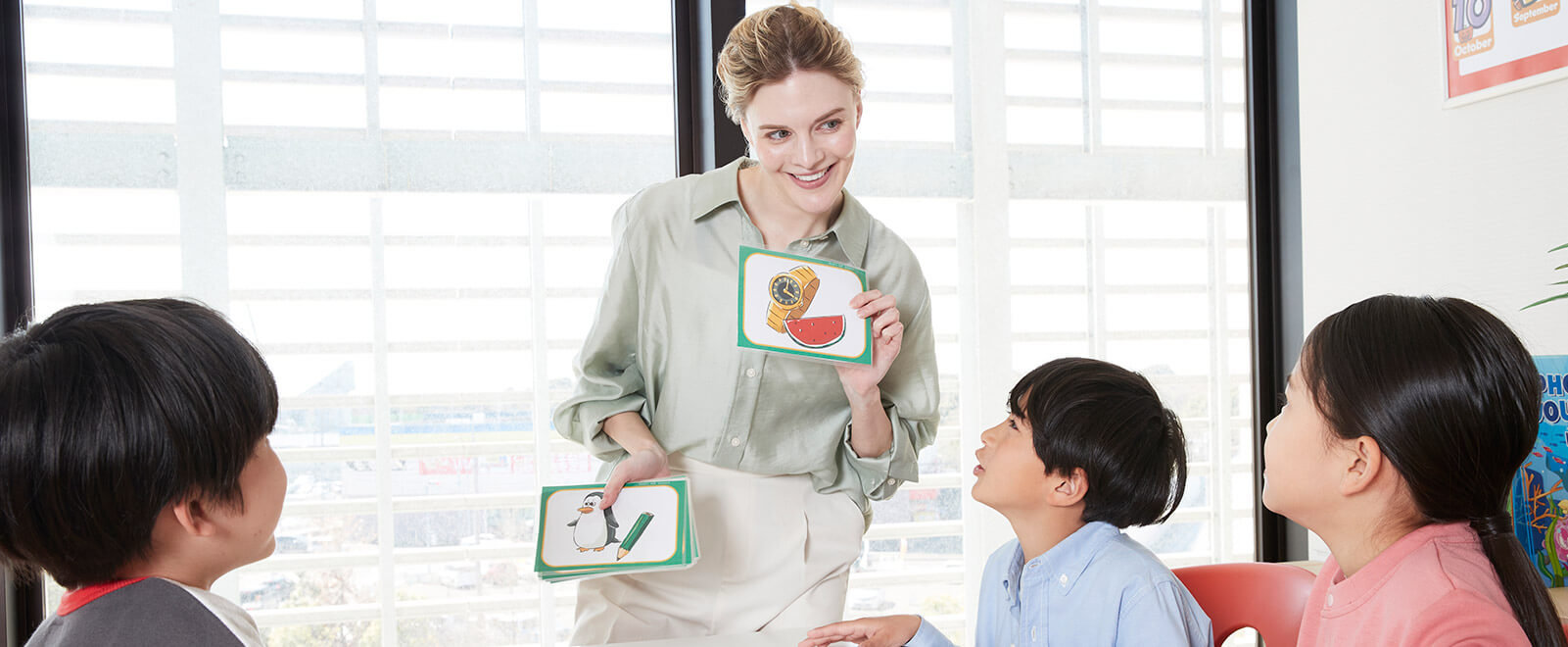 実践力・応用力・発信力・表現力をネイティブ講師が、4技能の基礎「フォニックス」を日本人講師が指導
